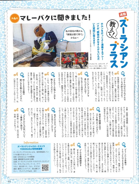 2023年5月10日 | 雑誌「Band Journal(6月号)」(音楽之友社)でズーラシアンブラス連載スタートしました。![]() ![]() |